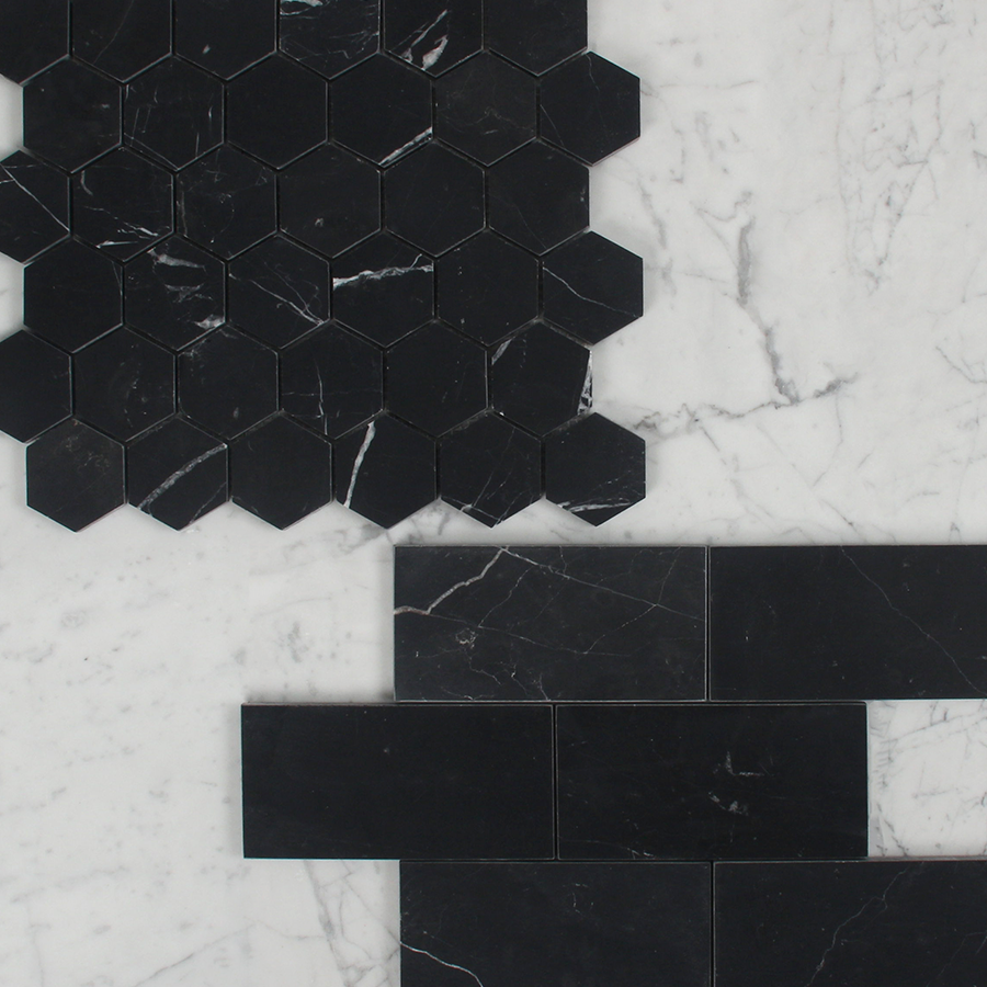Black & white Mixes, carrara mixed with nero marquina marble in all different styles. can be used wall & floor, ask us about sealing options.