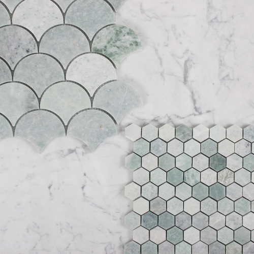 This stone is quarried in Brazil, with a luminous green & white deep crystal structure. We have a great range of mosaics, with the latest in fish scale (fan) look is very unique.